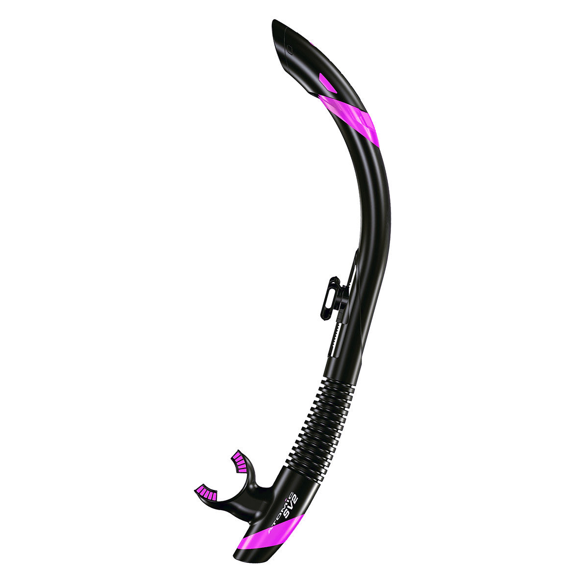 The SV2 is designed to limit splashed water from entering the breathing tube, by combining the Scupper Valve lower section with the sleek looking SV2 Semi-Dry top. SV2 is the perfect snorkel for rough or choppy water conditions.