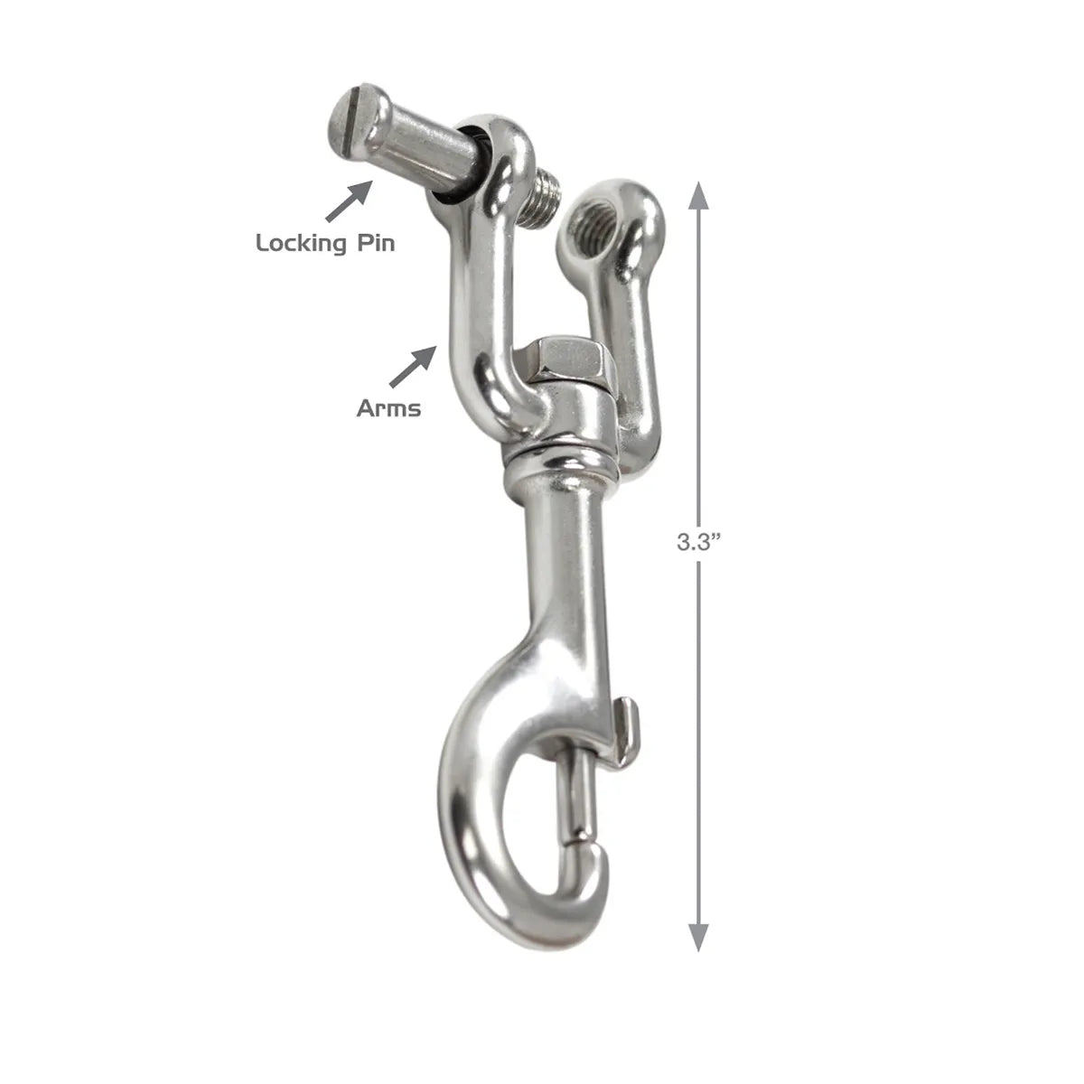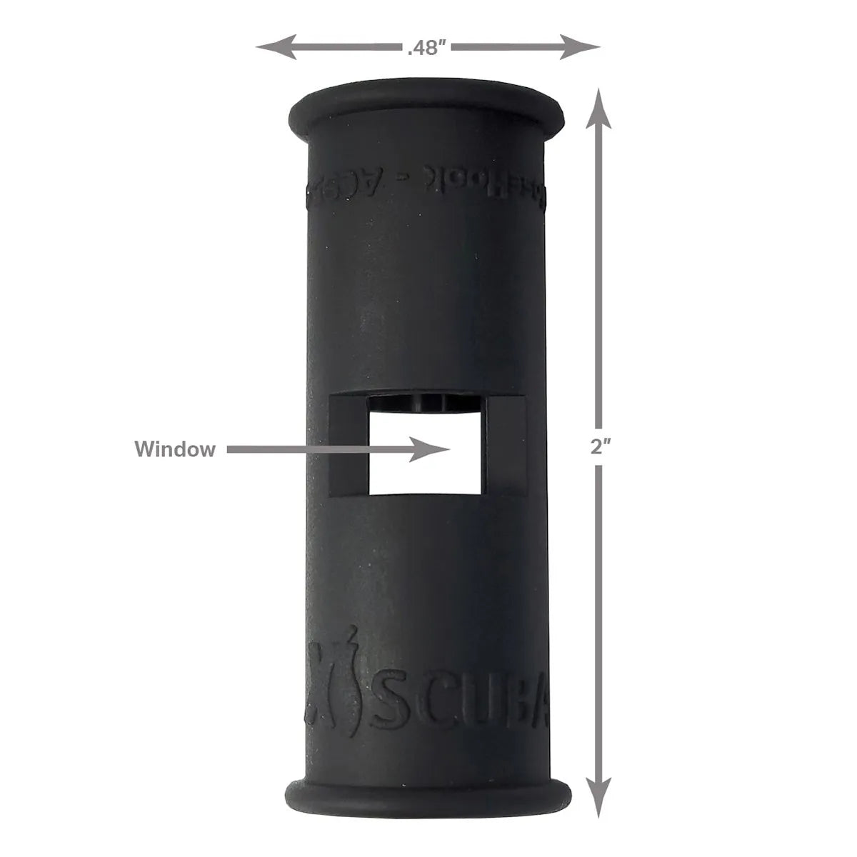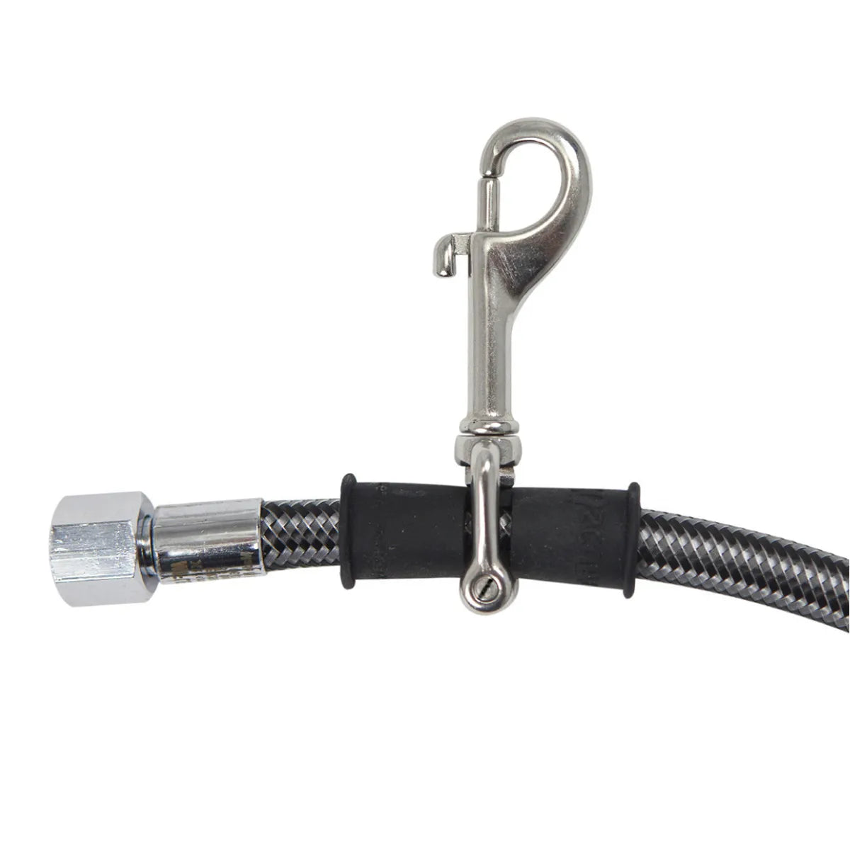 The attachment of a clip or accessory to a scuba hose can cause damage. Often, too much pressure is exerted on the hose surface, damaging the outer and/or inner layers reducing the hose strength. Damage to the inner layer can cause a break-down of material and potential reduced flow of gas. The use of any method other than the Hose Hook for attachment of clips/accessories will void the warranty of all Miflex and XS Scuba hoses. The XS Scuba Hose Hook is secure attachment of a clip without causing potential damage to the hose. Designed for use with all low-pressure scuba hoses with an approximate 0.5" (1.27cm) diameter, the 3.3" (8.4cm) Hose Hook is made from corrosion resistant stainless steel has a 360 Degree swivel arm with threaded locking pin for attachment to hose. The opposite end of the hook has a spring-loaded gate clip opening to attach the hook to your equipment. Also included is a (L x Dia.) 2 x 0.48" (5.1 x 1.23cm) silicone sleeve that is mounted on the hose for the hooks anchor position.