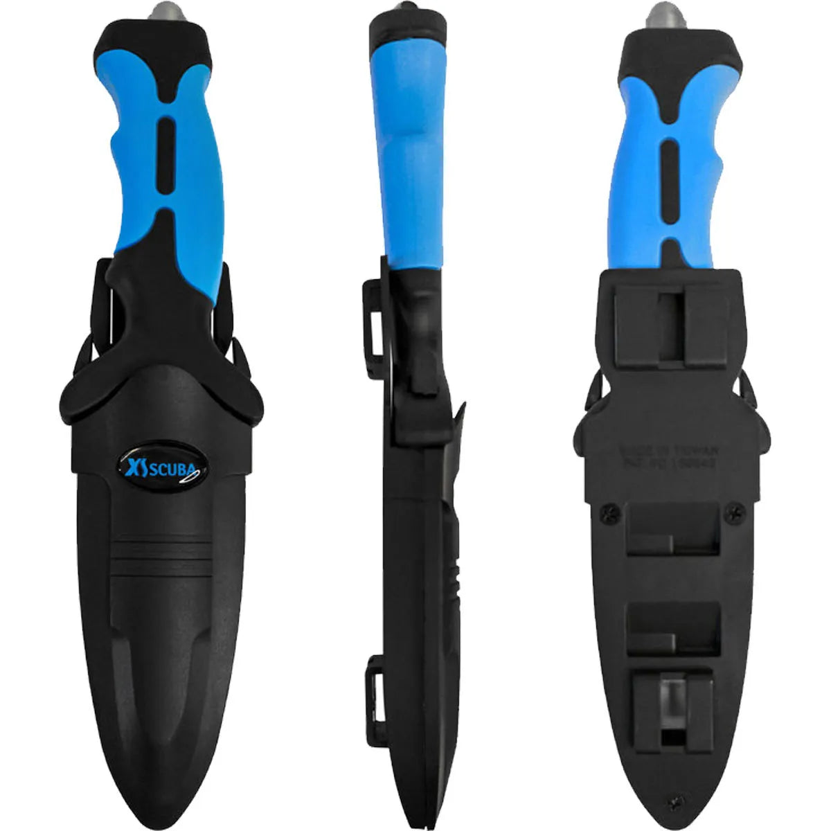 The Stryker Knife by XS Scuba is made from chromate treated 420 stainless-steel, for exceptional rust protection. The 4.75" (12.1cm) blade with blue and black handle looks great. The knife overall length is 10.75" (27.3cm). Blade has serrated edge on one side with a straight edge design on the other, is equipped with a line cutter and comes with a choice of a drop point or blunt tip. The blunt tip version can also double as a flat blade screwdriver if needed. Knife comes equipped with an easy-release positive locking sheath and depth compensating rubber leg straps with squeeze style quick-release buckles for easy donning and doffing.